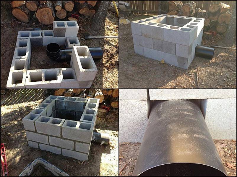 После укрепления фундамента можно начинать кладку шлакоблоком. В процессе предусматривается наличие дымохода длиною 1,5 м, диаметром 0,15–0,2 м.