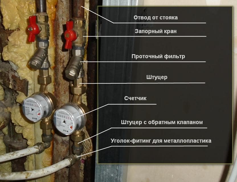 Простейшая схема установки счетчика воды в квартире выглядит так:
