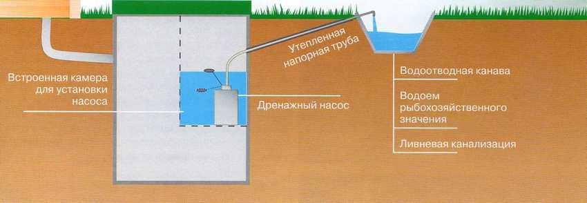 том, что дренаж будет почти что постоянно находиться в жидкости – например, собирать дождевую воду. Так что отвод жидкости будет в данном случае неэффективным, что говорит нам о том, что сток можно сделать либо напрямую в канаву, либо в особый колодец из которого дренажным насосом вода в дальнейшем будет откачиваться, опять же, в канаву.