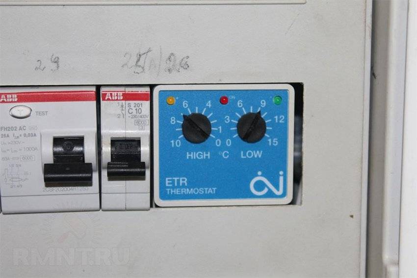 - Собственно, терморегулятора. Данный прибор призван включать в работу систему обогрева в заданном диапазоне температур. Обычно рабочий диапазон устанавливается в пределах -8..+3 градуса.