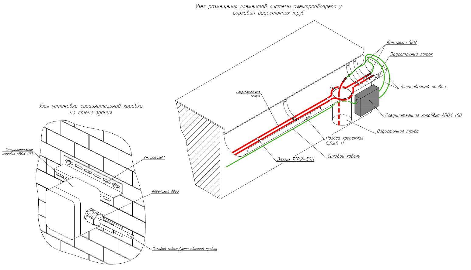 от конька крыши до земли. Стыки нагревательных кабелей кровли и желоба