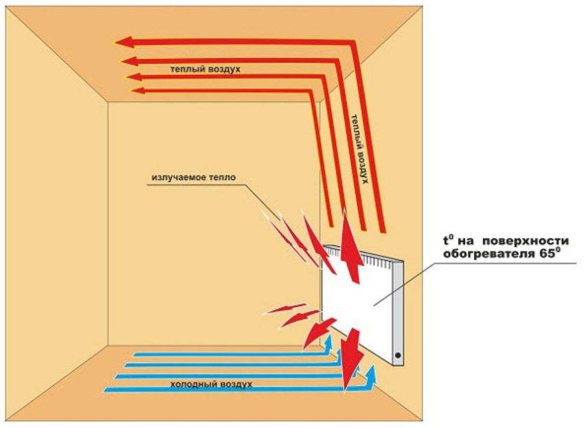 В конвекционном обогревателе также производится нагрев воздуха, однако его движение происходит при помощи естественной конвекции, а не принудительно. Холодный воздух попадает внутрь установки снизу, проходит через нагреватель и выходит сверху. После этого воздух распределяется по комнате также за счет естественных процессов.