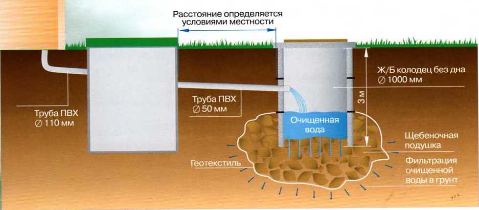 Принцип действия такой конструкции следующий: стоки из жилища попадают в – герметичный канализационный колодец. Здесь твердые частички оседают на дно, а осветленная вода перетекает в дренажный колодец, где и происходит ее доочистка и выпуск в грунт.