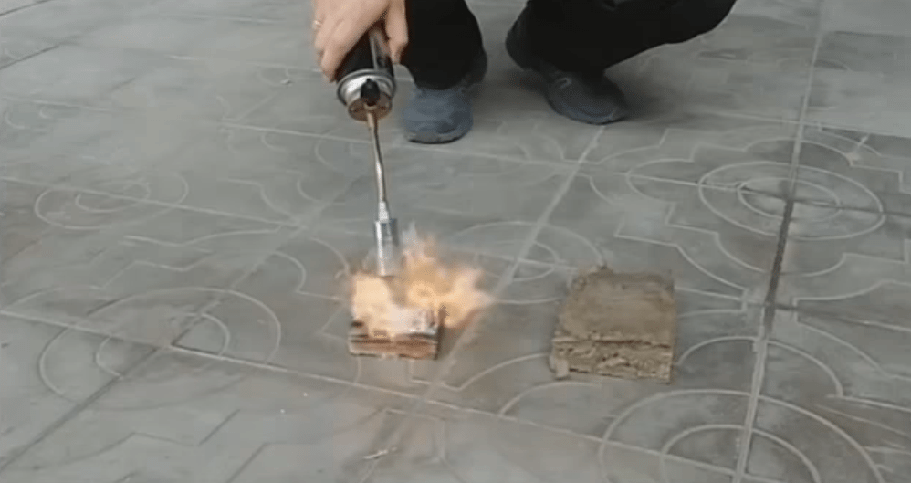 Подвергнем материалы более суровому испытанию. Направим огонь паяльной лампы в одну точку и попробуем прожечь плиту насквозь.