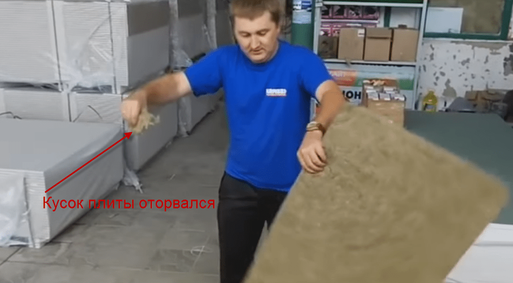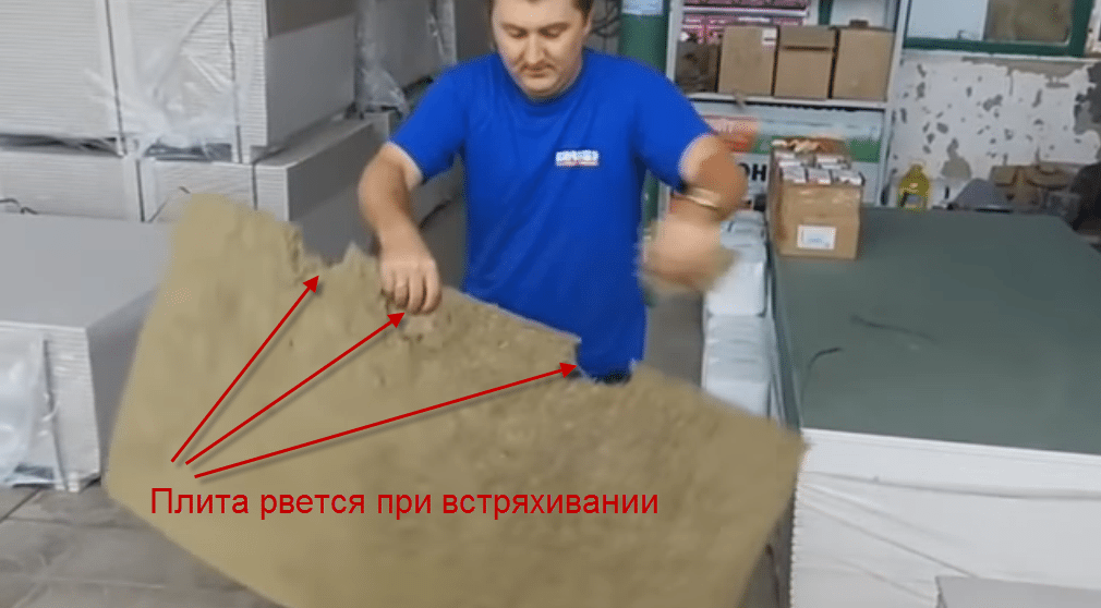 Плиту каменной ваты проверяем на прочность, для этого берем ее в двух местах и встряхиваем: