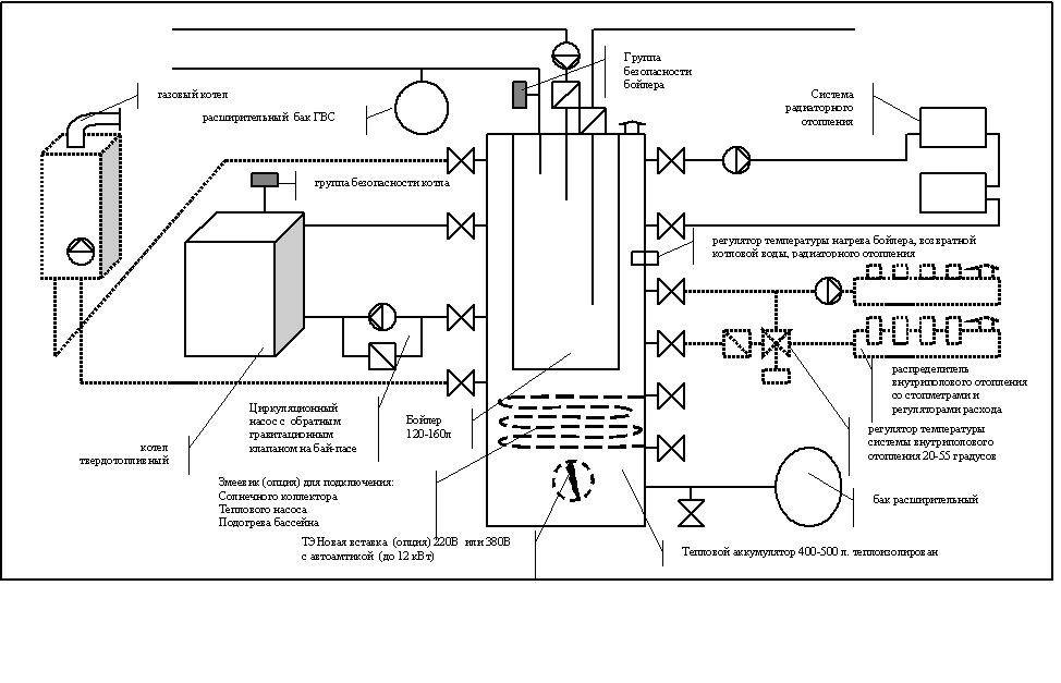 Самая простая схема отопления частного дома с принудительной циркуляцией ТЭНовым моноблочным электрокотлом, в котором уже имеются расширительный бак, циркуляционный насос, предохранительный клапан и воздухоотводчик.Схема отопления частного дома с простым электрокотлом, не имеющим расширительного бака и циркуляционного насоса.Упрощенная схема применения электрокотла в качестве резервного отопительного оборудования в связке с основным котлом и буферной емкостью. Электрокотел можно использовать во время действия ночной зоны суток со сниженными тарифами, а днем буферная емкость еще длительное время будет отдавать накопленное тепло.Схема подключения двухконтурного электрического котла.Схема отопления с электрокотлом и теплыми полами. Для развода теплых полов на несколько контуров используются гидроколлекторы.