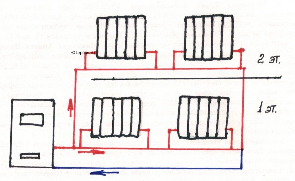 Применяется для многоэтажных зданий. Каждый контур подставляет собой вертикальный стояк, проходящий от чердака до подвала по всем этажам. Радиаторы подсоединяются боковым включением параллельно магистрали и последовательно на каждом этаже.