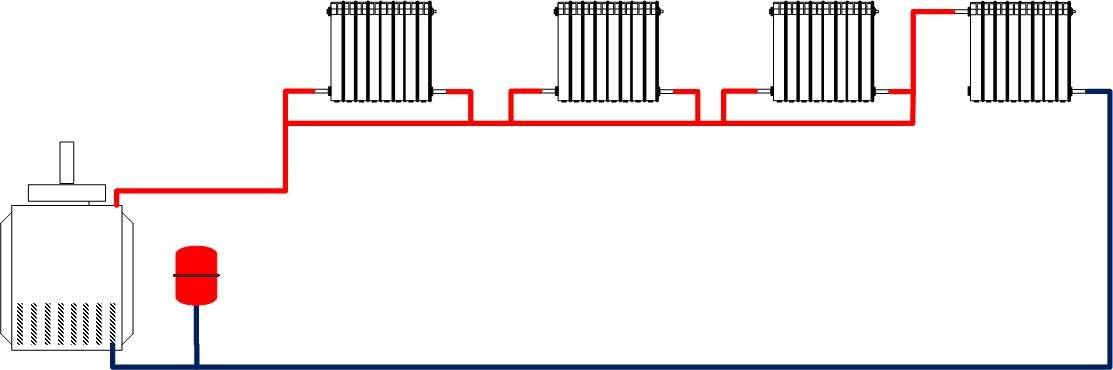 Тупиковая схема монтируется в большинстве загородных домов и имеет ещё одно название – с обратным (встречным) движением теплоносителя. К каждому радиатору подключают подающую и отводящую трубы. Циркуляция осуществляется насосом. Главное преимущество системы заключается в том, что ко всем радиаторам теплоноситель доходит одинаковой температуры, а с помощью регуляторов можно поддерживать необходимый микроклимат в каждом помещении.