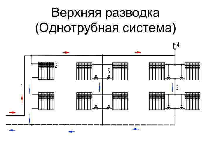 В этом случае трубы прокладывают выше радиаторов, от магистрали в зависимости от расположения приборов опускаются отрезки паропровода. Ниже батарей пускают систему для возврата конденсата, реализовать такую схему подключения достаточно просто. Из-за положительных характеристик подобный вариант стал популярным среди большинства потребителей.