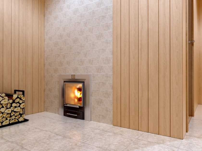 - Стены за печкой обкладываются специальной плиткой, имеющей устойчивость к жару. Также используются металлические листы;