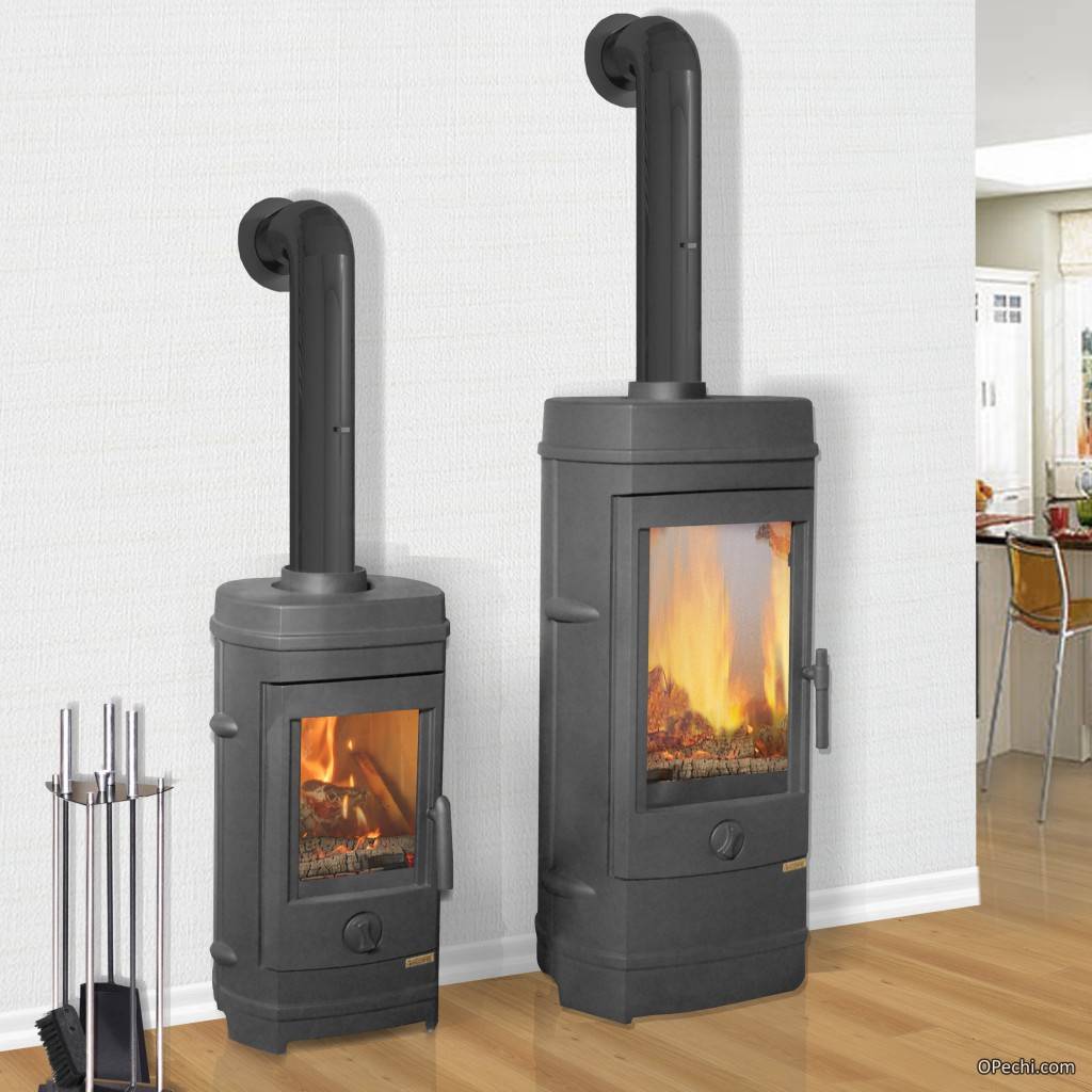 Компактное устройство почти квадратной формы, оснащенное витыми ножками, выглядит очень элегантно в классических интерьерах, прованс, стилизованных под старину. Оно относится к закрытому типу: плоское жаропрочное стекло полностью закрывает топку. Конструкция весом 120 кг изготовлена из чугуна, который отлично аккумулирует тепло, равномерно распределяя его. Толщина 8 мм стенок топки, ее герметичность позволяет достигать КПД 76%. Благодаря системе длительного горения на одной закладке дров можно обогреваться длительное время.
