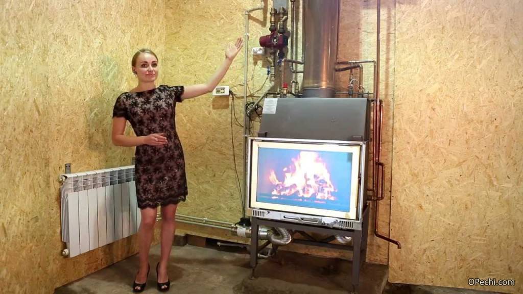 Если сравнить такую конструкцию с устройством твердотопливного котла, то она имеет очевидное преимущество. Печь не только повышает температуру теплоносителя, но и нагревается сама, а значит, прогревает и помещение. А благодаря наличию в составе прозрачной дверцы будет создаваться ощущения наличия в помещении камина с водяным отоплением.