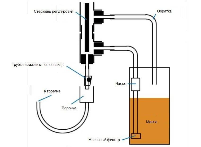 Капельная подача происходит по металлической трубке, которую подводят к масляному испарителю. Второй ее конец выводят наружу и гибким шлангом подключают к баку. В верхнем отделении капельного типа печи на отработке располагается дымовой патрубок, который подсоединяют к дымоходу.