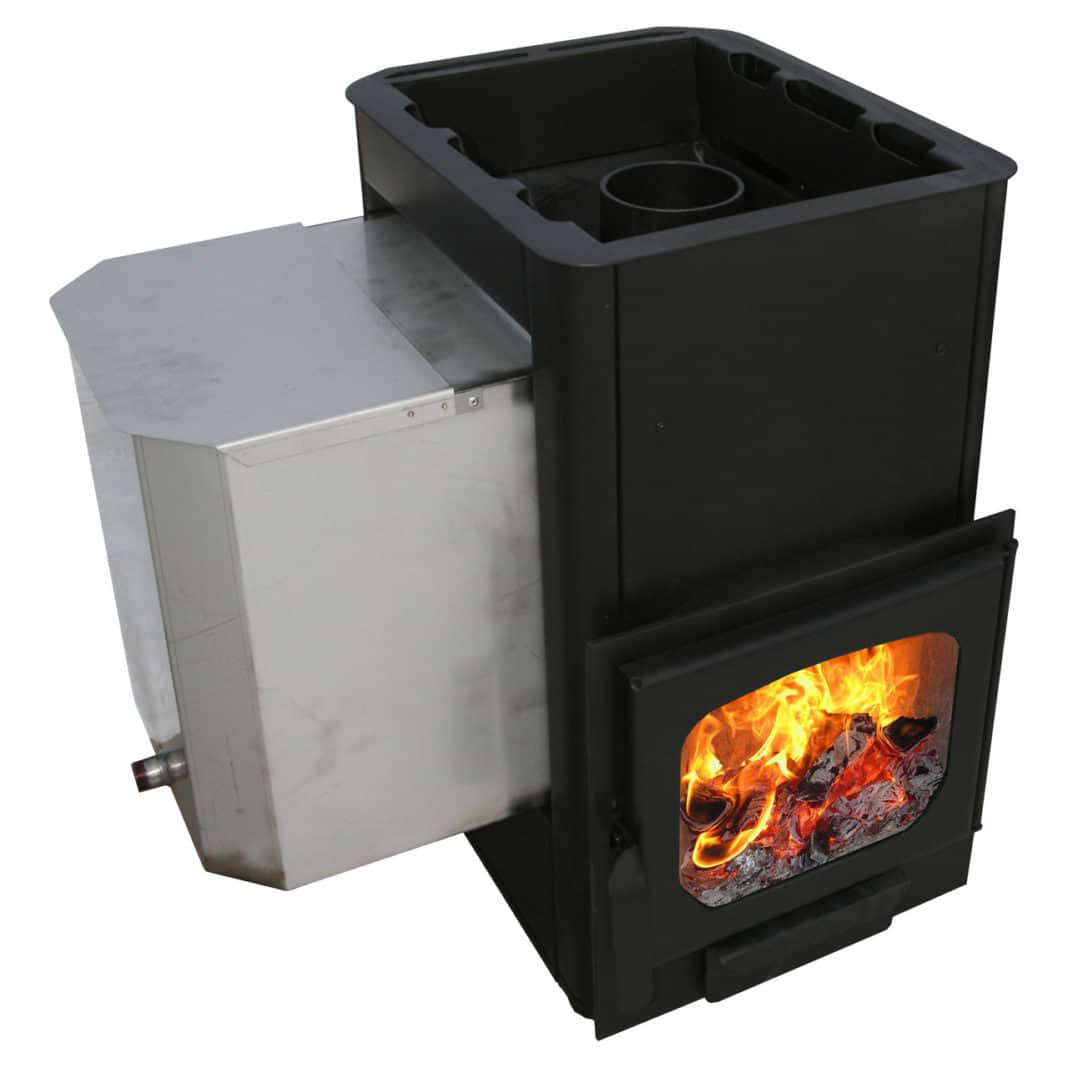 Вмонтированный контур нагрева воды позволяет комплектовать печь ёмкостью до 120 литров. Чаще всего она устанавливается наверху, исполняя роль согласующего элемента, между горячей трубой и потолочным перекрытием. Пользователь получает двойную выгоду — труба нагревает жидкость в баке, который позволяет не использовать защитные материалы для изоляции трубы от материалов перекрытия и потолка. Цифра 120 не может служить окончательной характеристикой модели, приобретая печь в комплекте с баком, его размер можно ограничить до 50 или 60 литров. Данная модель позволяет установку водяной ёмкости в другом месте (за пределами парилки).