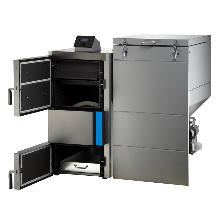 Является комбинированным твердотопливным отопительным аппаратом, который прекрасно подходит для обогрева частных домов, площадью до 300 кв.м. После установки горелки, можно отапливать дом при помощи пеллетов. Кроме того, это устройство в одновременном режиме, вместе с древесными гранулами, может использовать для обогрева дома дрова либо функционировать от электрической сети.