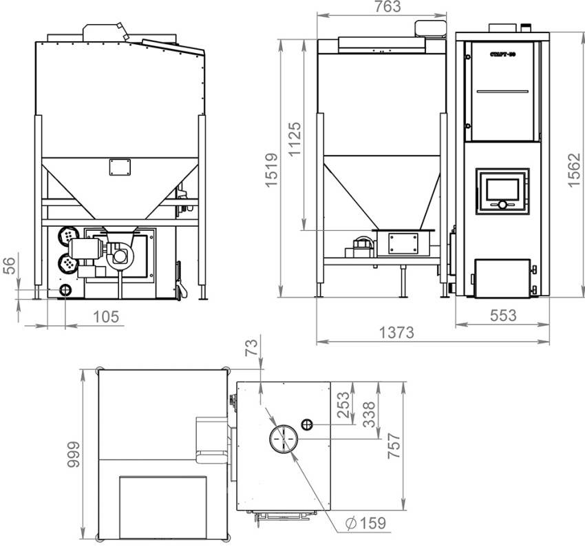 Правильно выбрать нужный экземпляр котельного оборудования поможет учет заявленной производителями мощности, она приводится к единице площади помещений, выраженной в кв. м. С ее возрастанием увеличиваются и размеры загрузочного бункера, а также габариты всего устройства