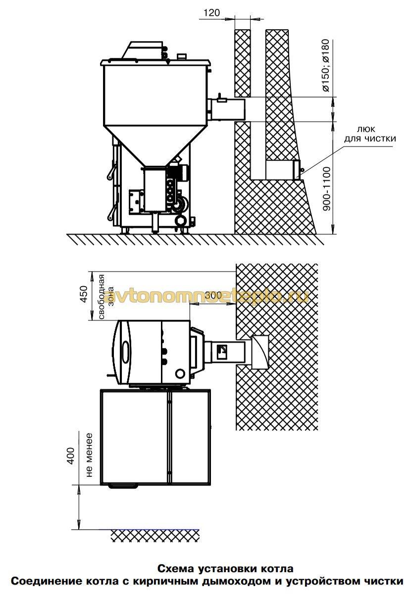 Спереди оставляют 1 м свободного пространства для удобства обслуживания котла. Сбоку до стен — минимум 0,5 м, интервал сзади — 0,4 м. Места стыков с дымоходом и трубами отопления тщательно герметизируют, чтобы избежать протечек и задымления комнаты.
