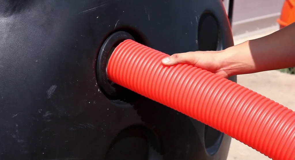 Затем производится ввод труб. В стенке колодца просверливают отверстие необходимого диаметра, зачищают от стружки и устанавливают адаптер герметичного ввода. Считается, что адаптер обеспечивает достаточную степень герметизации, однако мы рекомендуем дополнительно использовать водостойкую монтажную пену. Ввод трубы в колодец осуществляется на глубину 100-300 мм для создания запаса на случай деформации и движения материала.