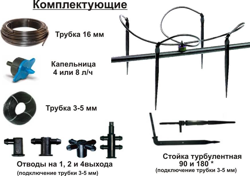 Для монтажа системы капельного полива требуются следующие элементы: