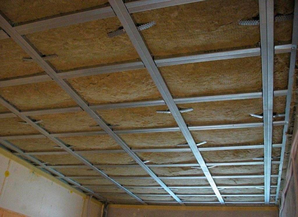 Обязательно нужно позаботиться о подвесном каркасе либо специальных креплениях, так как работы по крепежу осуществляются на весу. Легче всего заполнить термоизоляционным материалом пустоты между основой и подвесным потолком. Можно использовать и подвесы П-образной формы. При этом утеплитель продевается внутрь устройств, а после устанавливаются профили из дерева или металла. Но этот способ подойдет лишь в том случае, когда высота потолка позволяет их уменьшать за счет опускания каркаса.