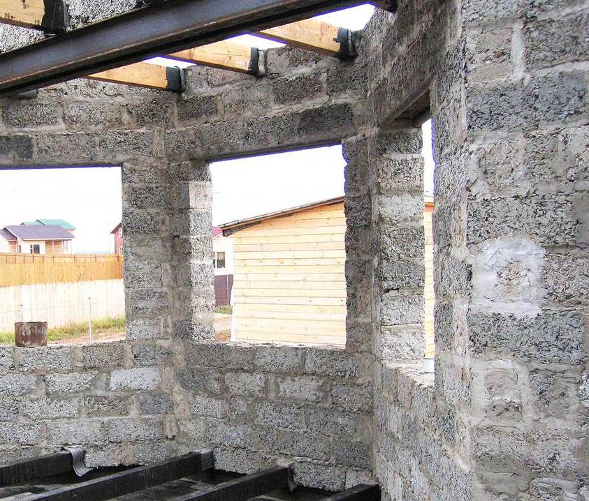 При строительстве дома из арболита для защиты стен от влаги кирпичный или бетонный цоколь поднимается на полметра выше отмостки. Вылет карниза за стену тоже не меньше 50-ти сантиметров. Перемычки из арболита для различных проемов армируются стальными прутами или сеткой. Строительная технология дома из арболита предусматривает и монолитный вариант заливки стен.