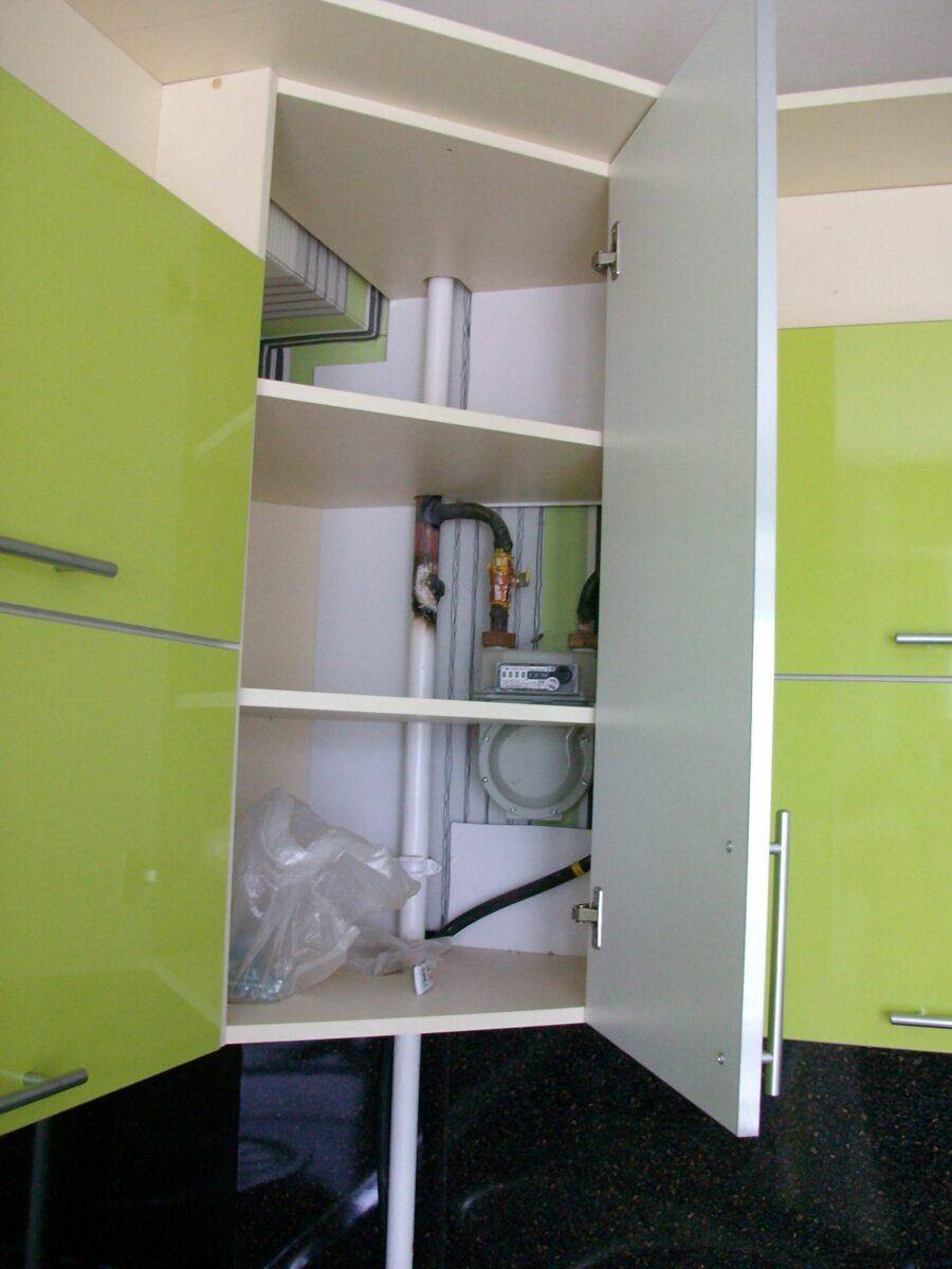 Газовые коммуникации, включая счетчик и колонку, нередко прячут за кухонной мебелью. Газовая труба на кухне и кухонный гарнитур поверх нее — разрешенный, но не во всех случаях выполнимый метод.