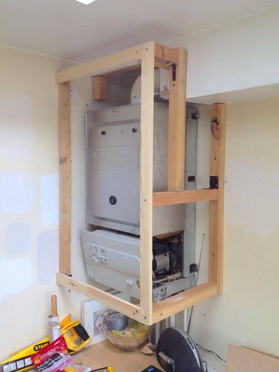 При изготовлении следует помнить про условия эксплуатации газового оборудования: расстояние между стенками мебели и котла, наличие вентиляционных отверстий, использование негорючих материалов для внутренней отделки. У короба должна отсутствовать задняя стенка, а по внешнему виду он должен напоминать обычный шкаф и гармонично сочетаться с остальной кухонной мебелью.