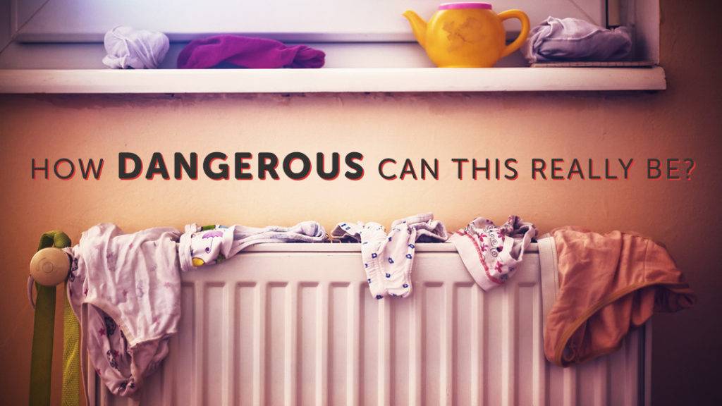 - На батареях и радиаторах отопления вещи очень быстро сохнут, но при этом страдают сами волокна. Из-за резкого испарения влаги вещи быстро изнашиваются и плохо поддаются глажке (особенно, если они пересохли).