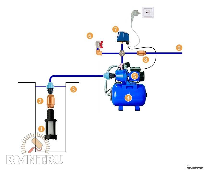 1. Скважинный фильтр грубой очистки. 2. Обратный клапан. 3. Колодец или скважина. 4. Гидроаккумулятор. 5. Насос. 6. Линия для заполнения системы водой. 7. Реле давления. 8. Обратный клапан. 9. Линия к потребителю
