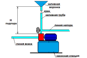 После этого, насосную станцию и всасывающую магистраль необходимо заполнить водой (это делается через специальное отверстие в насосе).