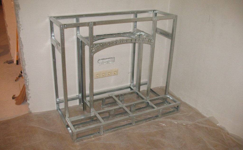 Размечают место установки каркаса по уровню. Прокладывают кабель и устанавливают розетку для электрокамина при необходимости. Нарезают оцинкованный профиль в соответствии с чертежом. При необходимости выполнения изгибов или волн П-образный профиль подрезают ножницами по металлу по боковым сторонам, после чего сгибают до нужной формы. Крепят заднюю часть каркаса к стене на дюбель-шурупы.