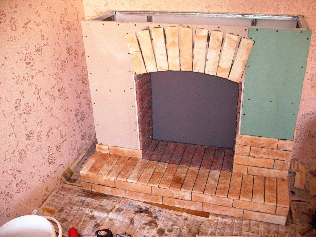 Если в качестве отделочного материала выбран тяжелый камень или плитка, каркас обязательно крепят к стене. Можно также придать устойчивость конструкции, сделав основание, выступающее вперед на 30-40 см. В нижней части, образованной основанием, можно сделать нишу – имитацию поленницы, и позже уложить в нее настоящие дрова.