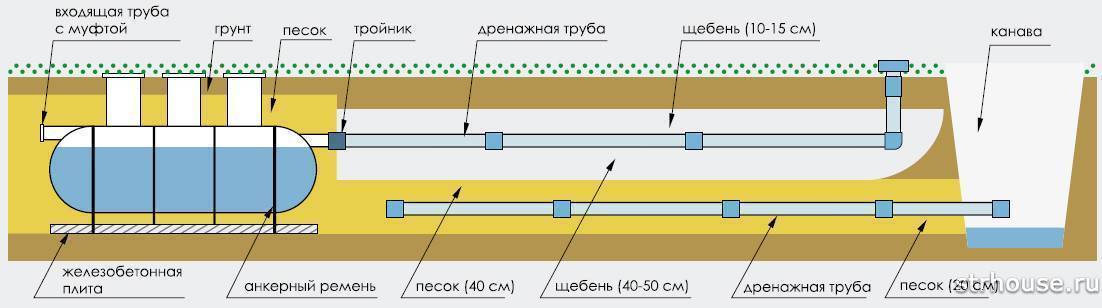 Фильтрация должна проводиться через дренажную подушку из щебня, на которую сточные воды должны подаваться по трубам. Для попадания канализационной воды на фильтрующую поверхность дренажа в трубах делаются пропилы или отверстия. Вся конструкция сверху засыпается землей. Трубопровод не должен быть виден на поверхности почвы.