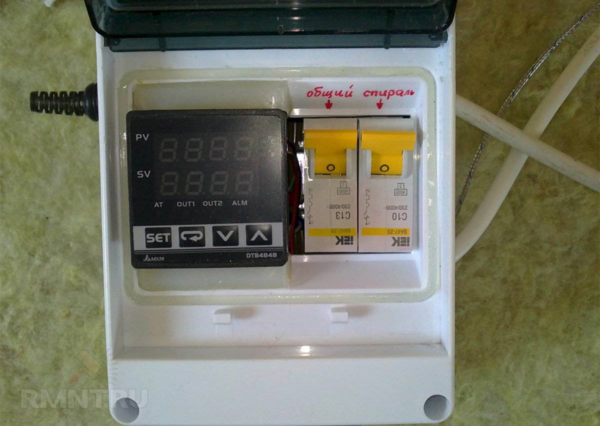 Из корпуса спираль может выходить на задней или одной из боковых стенок. Провода должны быть присоединены к выключателю, который следует расположить на внешней поверхности печи. При условии, если будут сделаны два контура, в процессе работы конструкции вы сможете регулировать мощность агрегата.