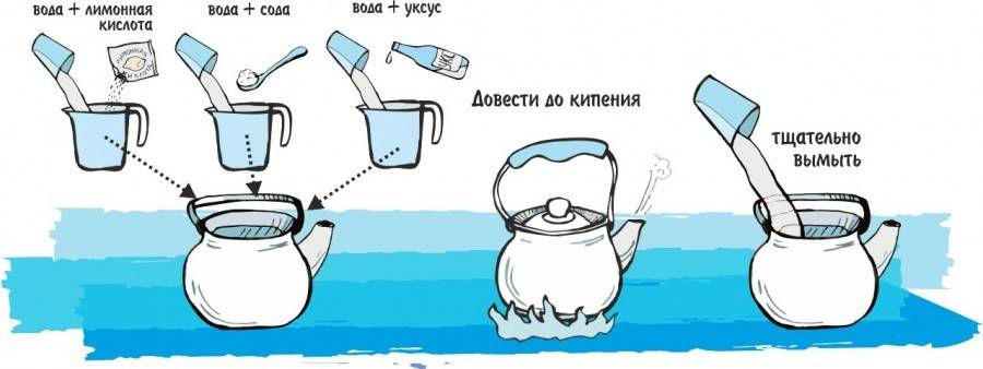 Раствор доводится до кипения, затем жидкость сливают. Далее заново заливается вода с лимонной кислотой из расчета 1 ст. ложка кислоты на чайник. Кипятится такой раствор около 30 минут на медленном огне, затем сливается.