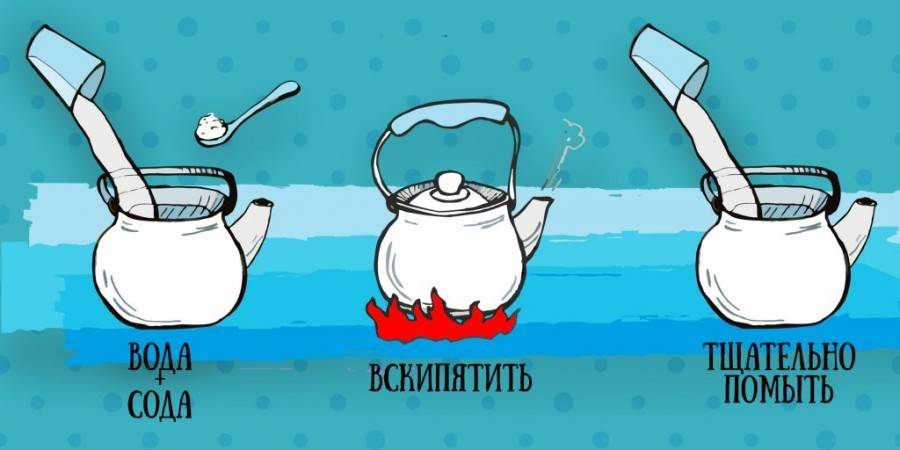 В чайник наливается вода с добавлением пищевой соды (20 г.), раствор подвергается кипячению в течении 20-30 минут, после чего жидкость сливается.