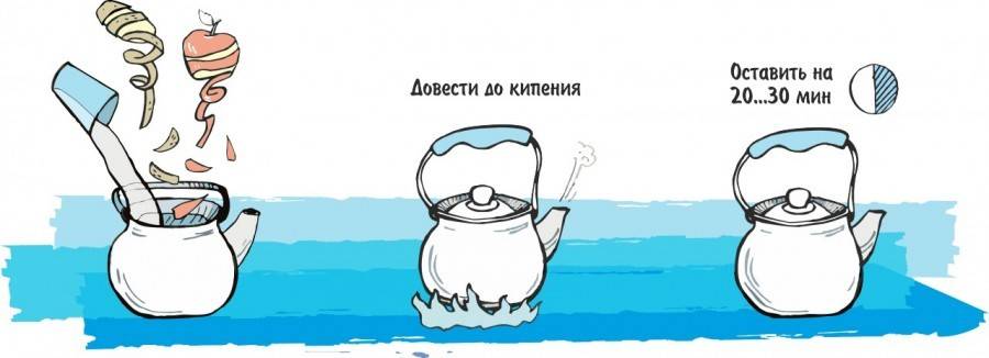 Раствор кипятят 30 минут, сливают, а поверхность чайника тщательно моется с применением губки.