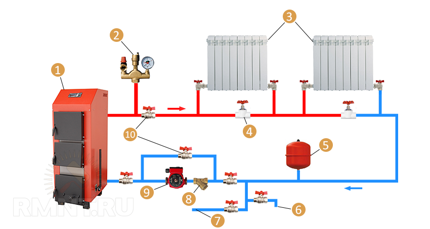 Пример однотрубной системы отопления с принудительной циркуляцией: 1 — котёл; 2 — группа безопасности; 3 — радиаторы отопления; 4 — игольчатый кран; 5 — расширительный бак; 6 — слив; 7 — водопровод; 8 — фильтр грубой очистки воды; 9 — циркуляционный насос; 10 — шаровые краны