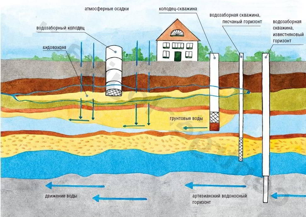 Чтобы достичь глубоких водоносных горизонтов, которые залегают между водонепроницаемыми слоями на глубине в несколько десятков метров, бурят скважины. Больше всего распространены два типа скважин на воду.