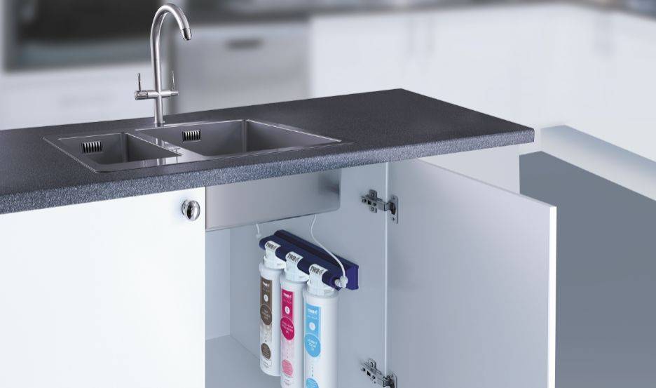 Самый сложный из фильтров проточного типа. Требует пространства под мойкой и иногда помощи специалиста при установке. Представляет собой набор картриджей, расположенных по ходу воды с увеличением степени очистки. Обычно система состоит из 3 картриджей. Первым идет картридж из полипропилена в 5-10 мкр, дальше угольный фильтр, замыкает систему полипропиленовый картридж в 1-5 мкр.
