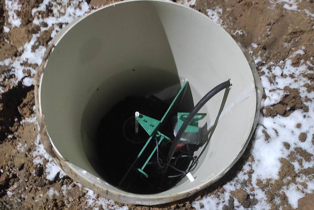 Прежде чем опустить станцию в котлован, рабочие откачали накопившуюся в яме воду. Затем уложили на дно подушку из песка и цемента и утрамбовали ее виброплитой. Получилось ровное и прочное основание. На него вертикально установили станцию и обсыпали ее по периметру песчано-цементной смесью. Всего ушло 10 мешков цемента по 40 кг.