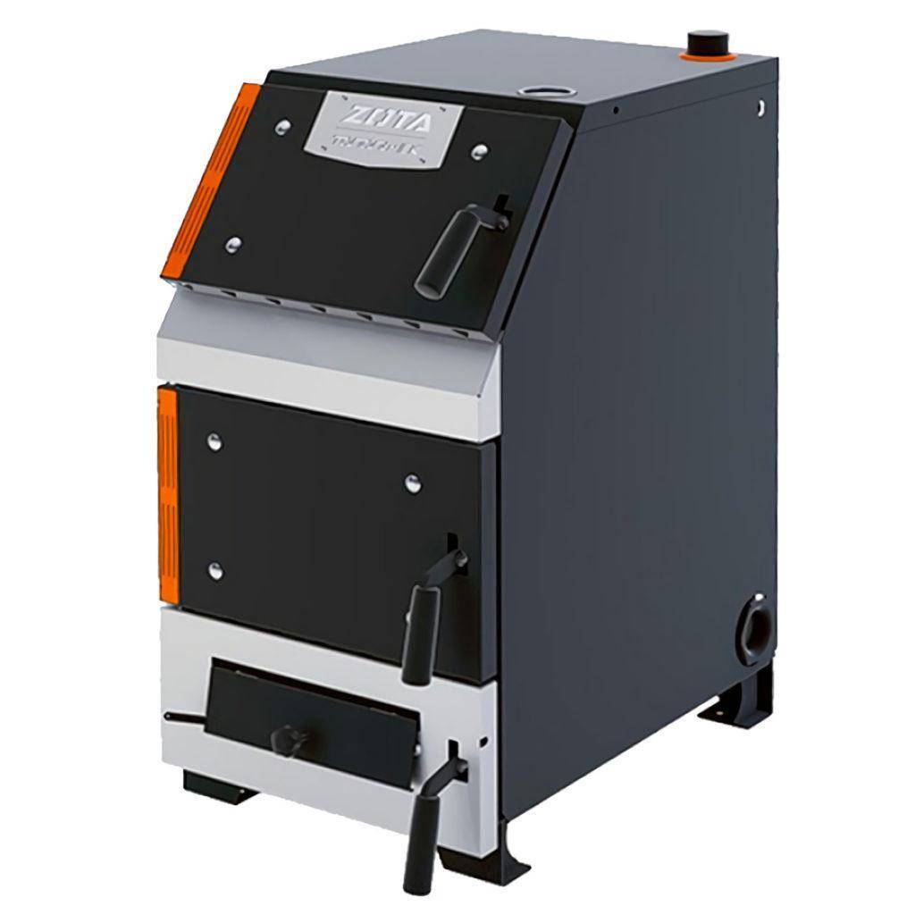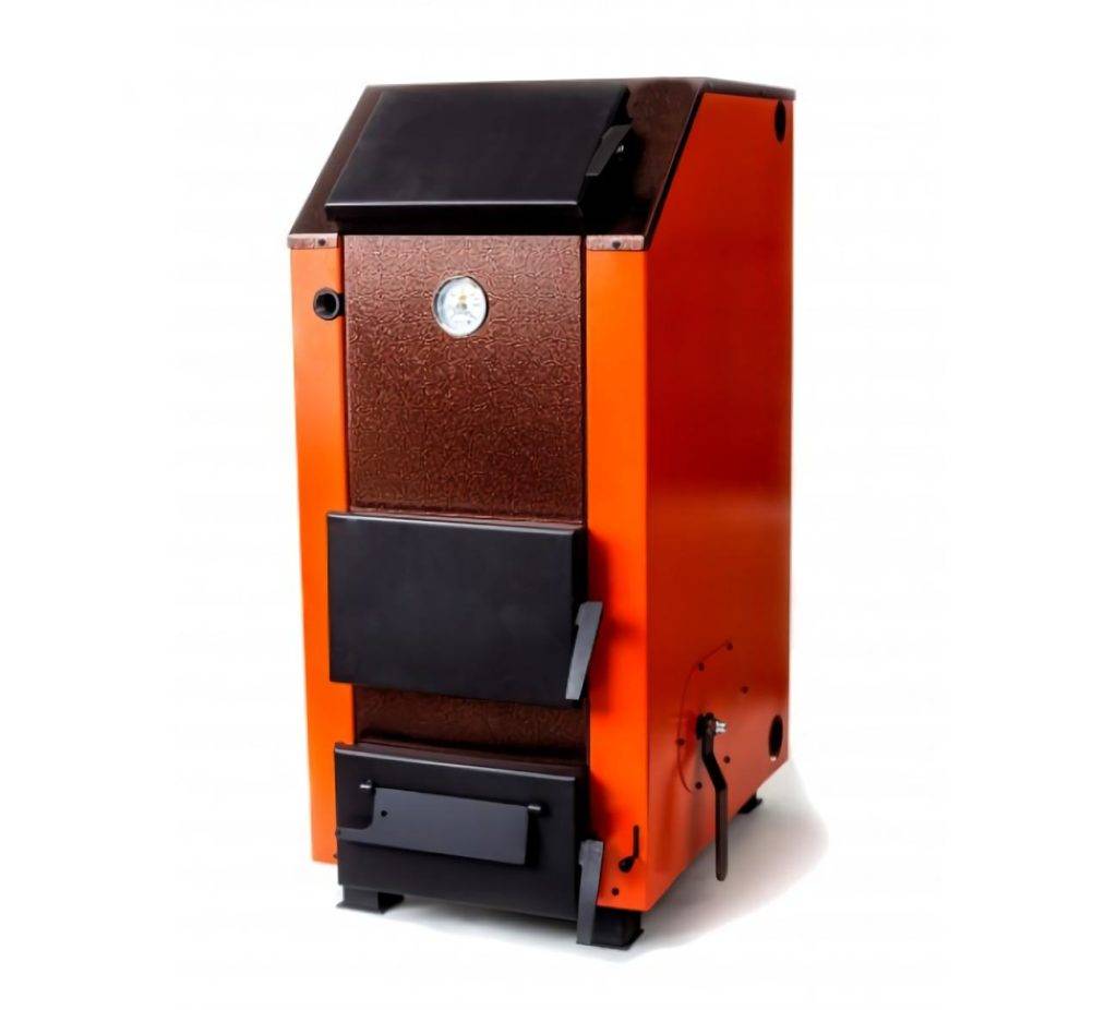 Котел подойдет для помещений с площадью 100 м². У него открытая камера сгорания с дверкой на фронтальной панели для подкидывания дров. В нижней части агрегата происходит пиролиз и сгорание газа, не оставляющего твердого остатка. В продаже есть твердотопливные модели с выходом патрубков для подключения как на правую, так и на левую сторону. Котел полностью энергонезависимый, но в нем опционально предусмотрена возможность установки ТЭНа. Выход дымохода с диаметром 120 мм облегчит поиск качественной трубы для монтажа канала, вытягивающего отработанные газы. Но производитель сэкономил на оснащении, поэтому в нем нет даже градусника.