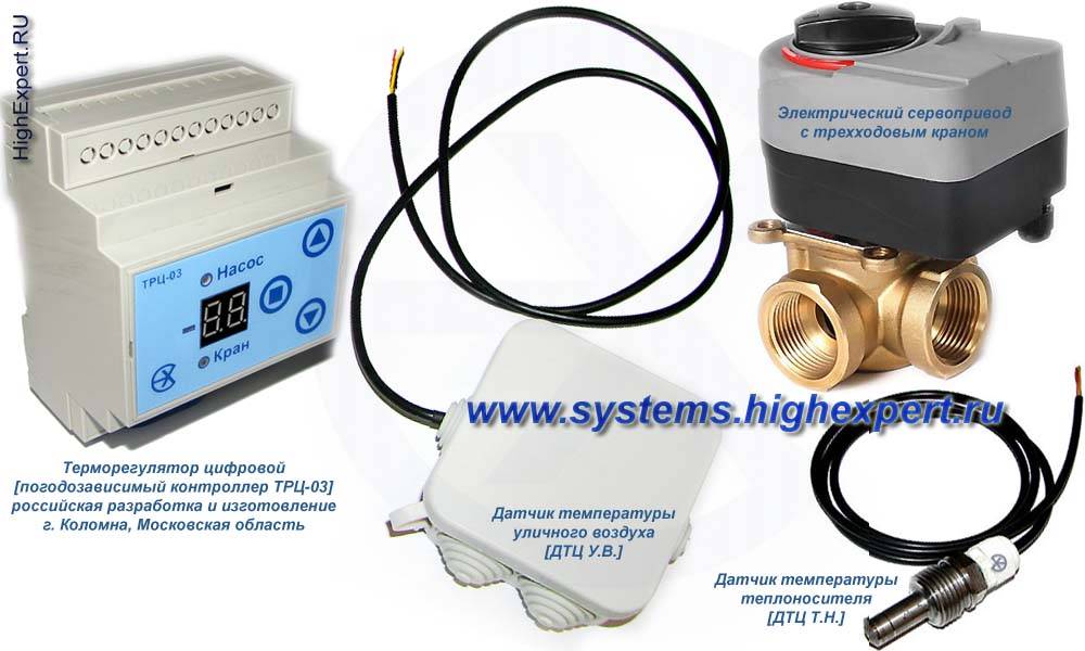 - Трехходовой смесительный кран (клапан) с электрическим сервоприводом – исполнительное устройство;