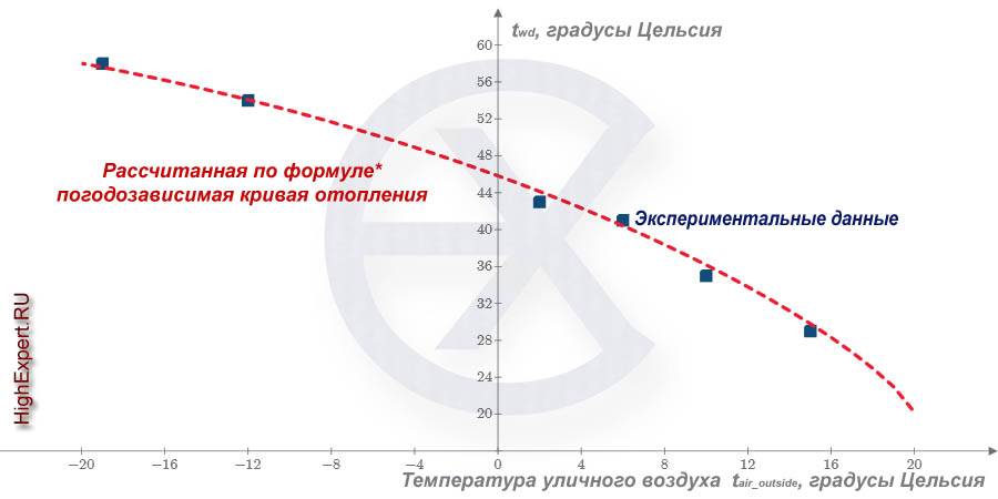 Полученная расчётный путём погодозависимая кривая отопления имеет выраженный наклонный характер. Для обеспечения комфортных условий и микроклимата с температурой воздуха +20 градусов Цельсия в жилых помещениях рассматриваемого жилого дома с радиаторной системой отопления: при нулевой температуре уличного воздуха температура теплоносителя должна быть около +45 градусов Цельсия, с падением температуры воздуха на улице до -20 градусов Цельсия температура воды должна быть повышена до +58 градусов Цельсия, т.е., как минимум, на 13 градусов.