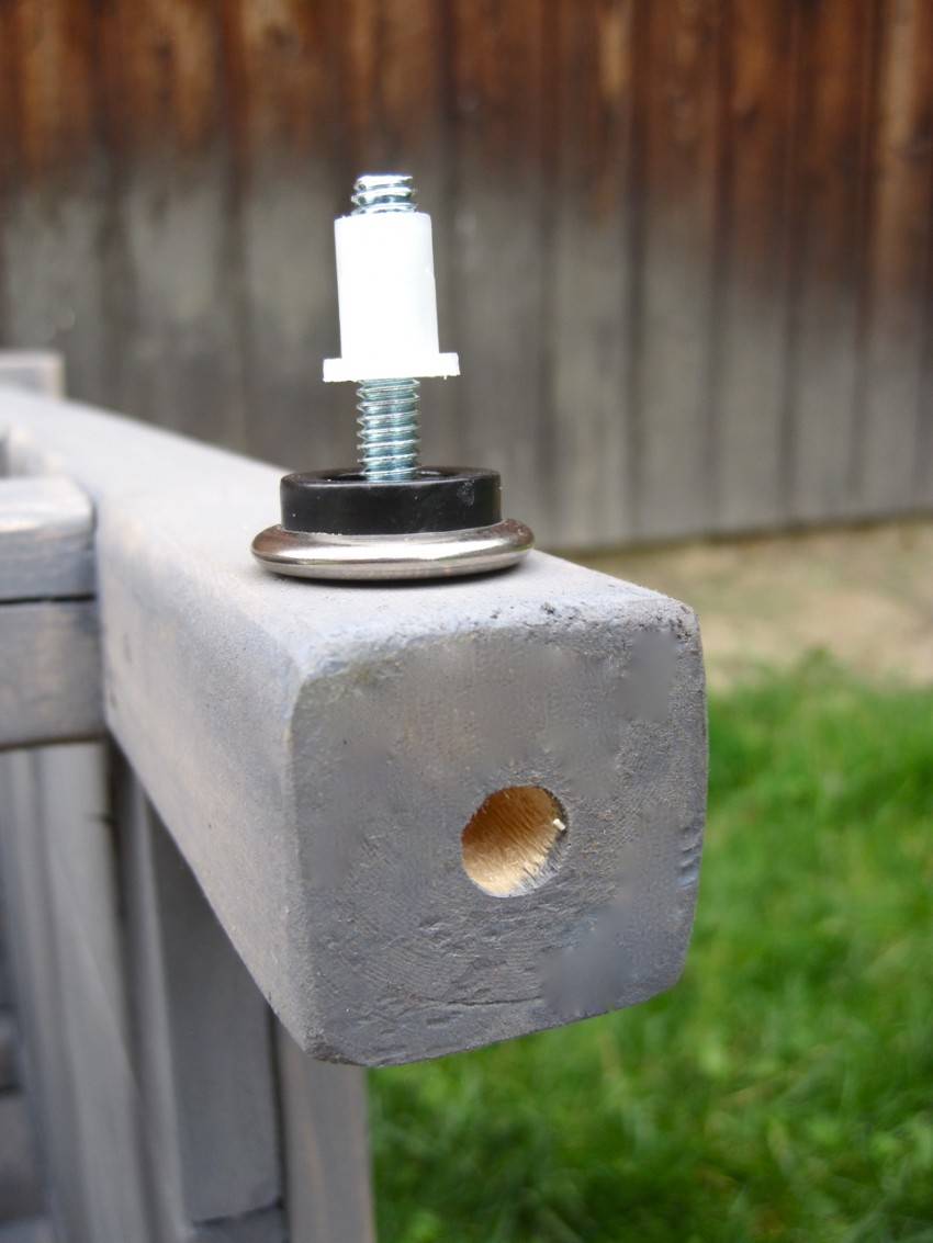Можно применить разные способы плетения гамаков своими руками, но в этом случае мы просто соединим все веревки в одном месте. Для этого сделайте на конце узел и проденьте веревку сначала через люверс, а затем через рейку.