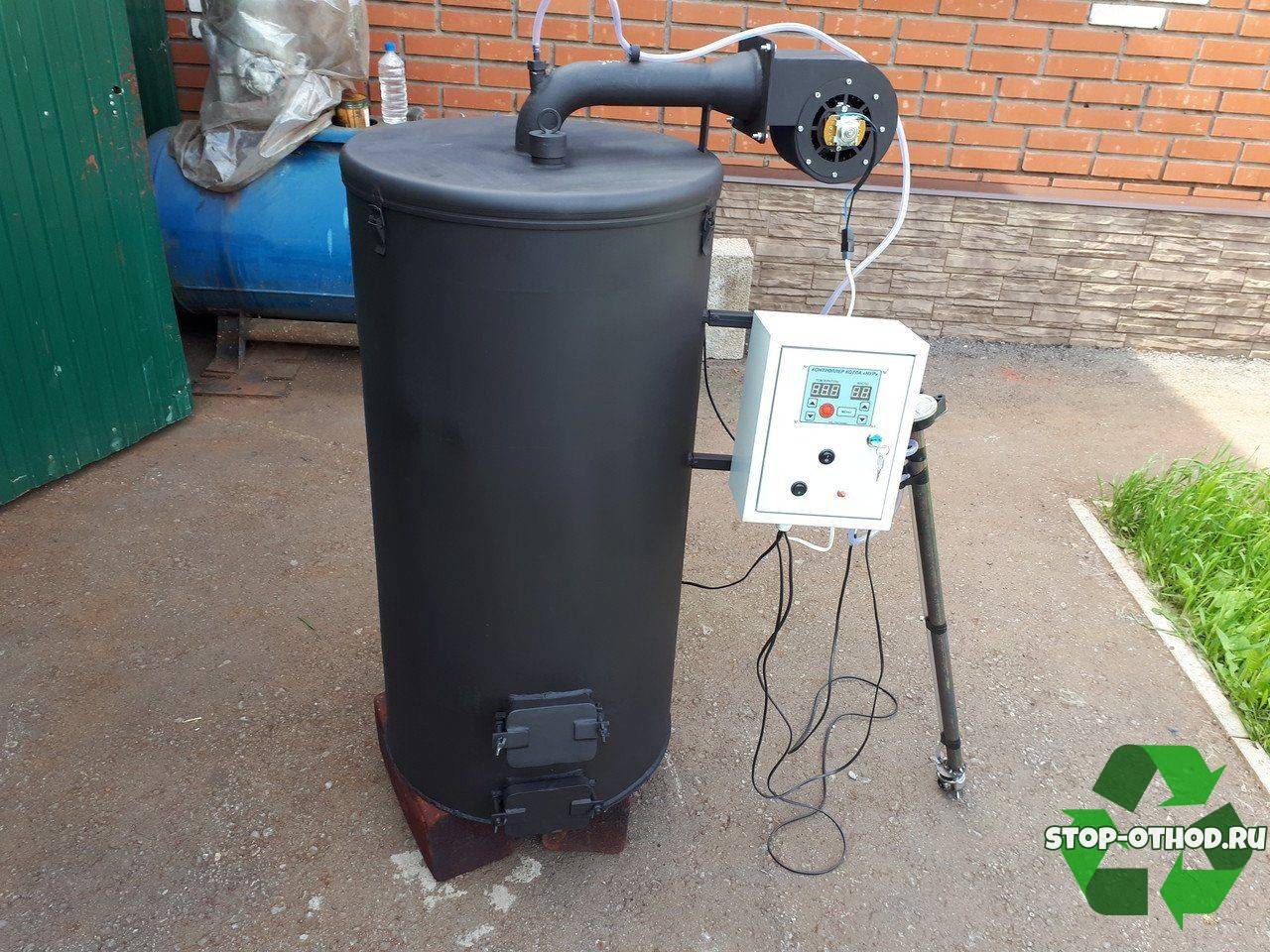 Самодельный котел имеет небольшие размеры, но при этом обеспечивает 15 кВт тепловой мощности. В час он расходует не более 1,5 л отработки в час. Воздух в камеру сгорания нагнетается с помощью небольшой турбины, поэтому нужно будет озаботиться подведением электричества к агрегату. Горючее поступает в зону сгорания порциями из отдельного бака, оснащенного вентилем. Последний может служить регулятором нагрева.
