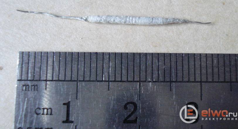Почти готовый нагревательный элемент (осталась просушка), длина 15 мм, диаметр 2 мм. Оптимальное напряжение питания 12 В, мощность 8 Вт. Просушка – на горячую батарею отопления, на следующий день подключил к БП подал напряжение достаточное для нагрева до 50 градусов (контроль мультиметром в режиме измерения температуры) – дал остыть и разогрел до 100 градусов, потом ещё до 150. Можно ставить по месту, эксплуатационные испытания на следующий день.