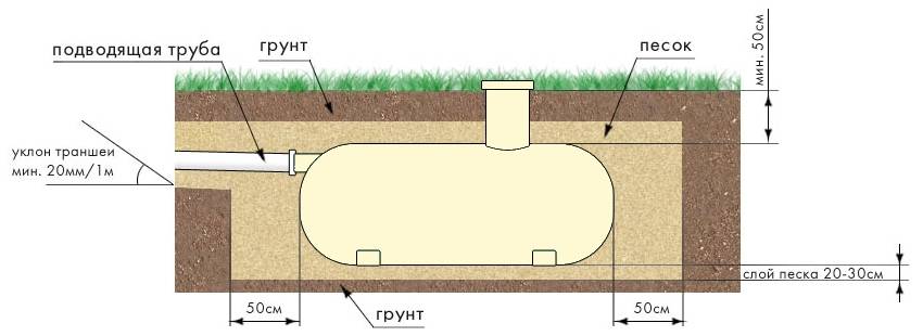 Завершающим этапом монтажа является непосредственная установка емкости. Чтобы минимизировать риск ее замерзания, закапывать нужно на глубину 1,5 м. С целью сохранения форм емкости, перед закапыванием ее нужно наполнить водой.
