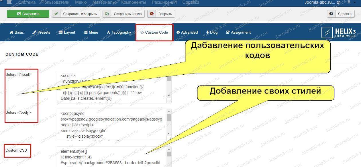 Исправить этот и любой другой недостаток дизайна можно на вкладке «Custom Code». Здесь же можно добавить скрипты сбора статистики Яндекс Метрика и Google Analytics.