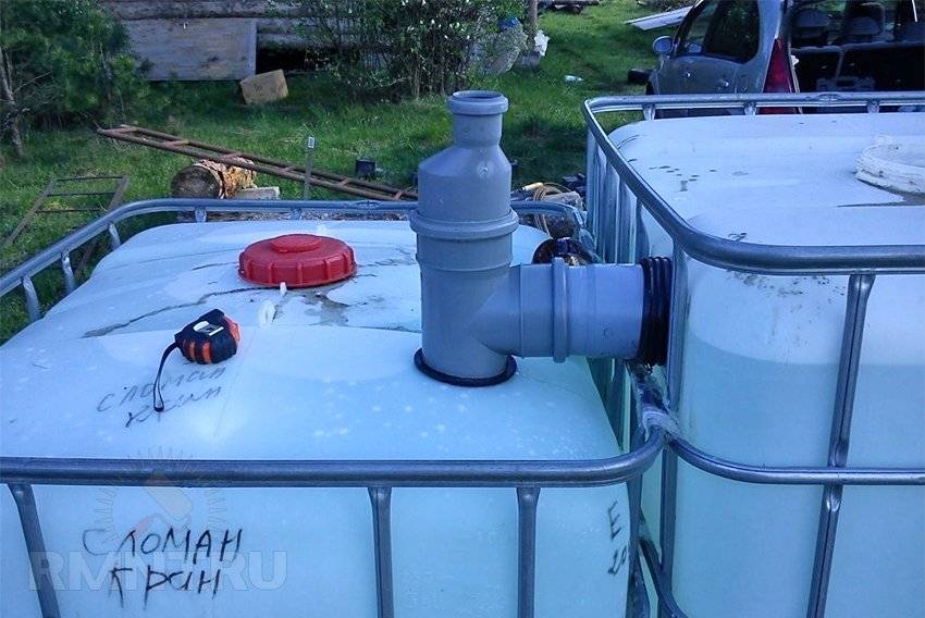 Второй тройник необходим для того, чтобы соединить две емкости между собой при помощи трубы. Также ко второму тройнику прикрепляется еще одна труба меньшего диаметра, служащая для вентиляции.